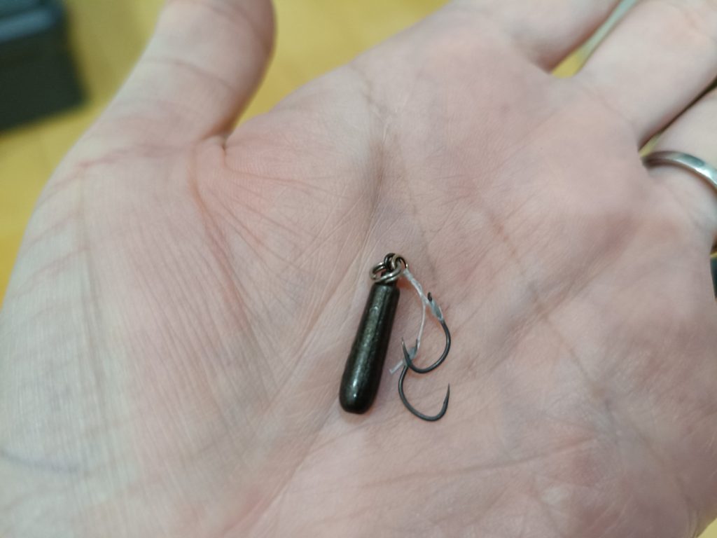 これは2.5gのスティックシンカーにグレ鈎で作ったアシストフックを取り付けたチニング用の強化版イソメリグです。