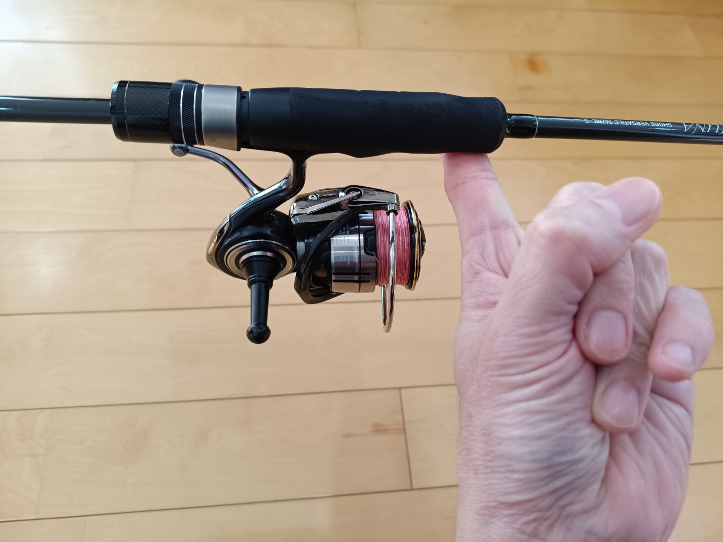 下の写真のように、ロッドグリップが短いので、ロッドを脇に挟んでのやり取りというものができません(やろうと思えばやれるけど)、ですのでデカい魚相手だと疲れます。