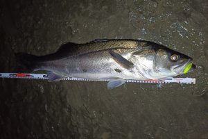 状況としては、潮止まりの時間帯でしたが、満潮の潮止まりなので魚が岸際に寄っていたのか、かなり手前でのヒットでした。